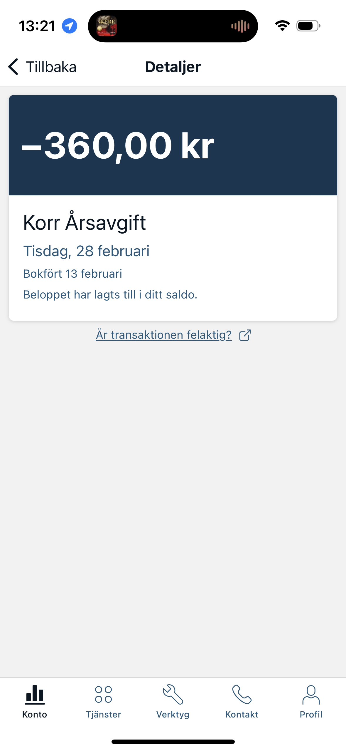 Blev debiterad årsavgift 31/1 á 1855kr. Idag blev jag krediterad 200kr för densamma