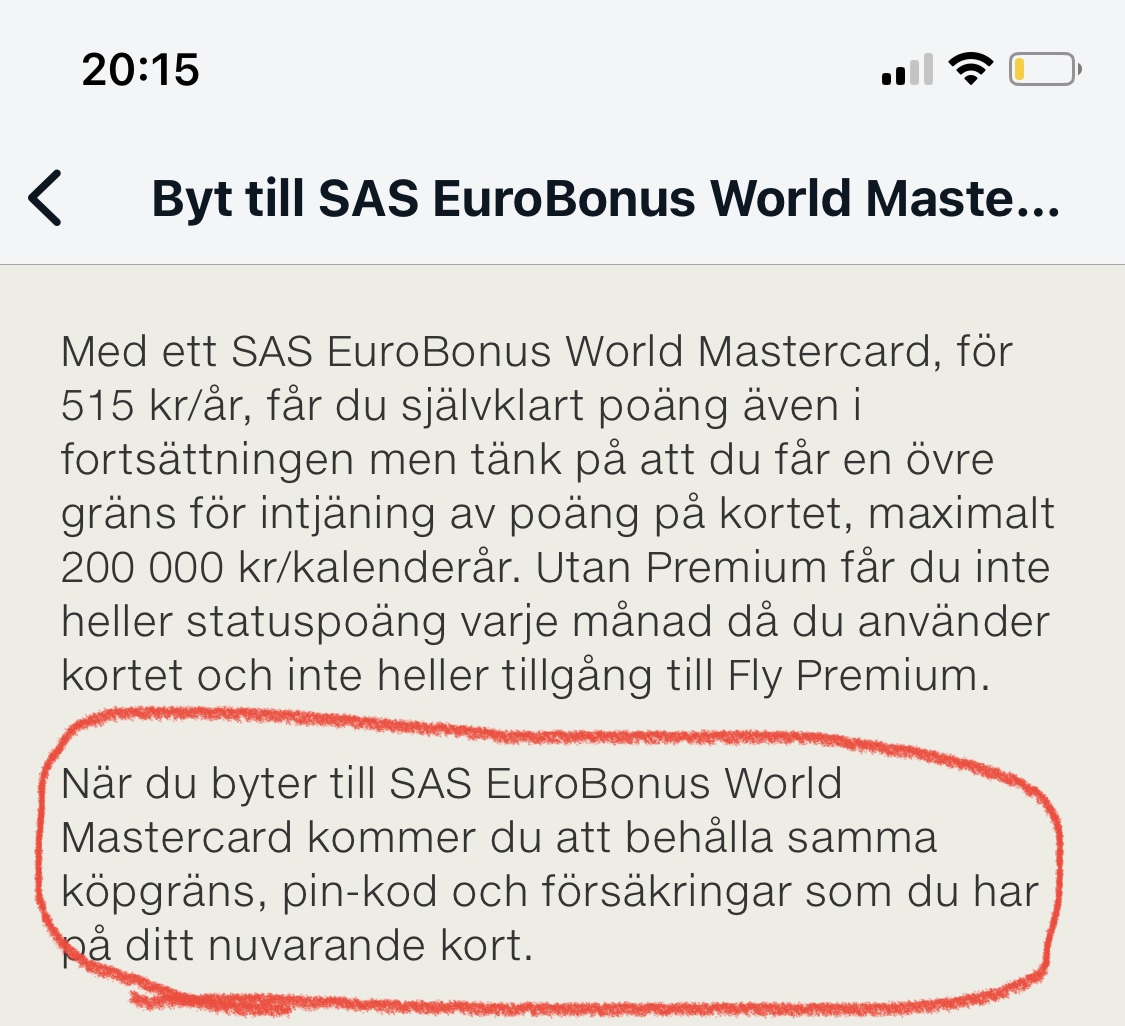 Var på semester i Frankrike/Spanien i somras och tänkte maxa "dubbla poäng vid köp utomlands". Dvs planen var att använda SAS MC Prem istället för debetkortet. För att undvika att slå i taket på kreditlimiten så betalade jag in både priset på flygbiljetterna samt resp. hotellräkning i samband med att jag checkade ut från hotellen för att på så sätt nollställa krediten, dvs jag hade ingen "överlikvid". Det gick bra på första hotellet i Paris, dock på andra hotellet i San Sebastian där blev köpet nekat trots att jag hade i princip 90% av limiten tillgodo.