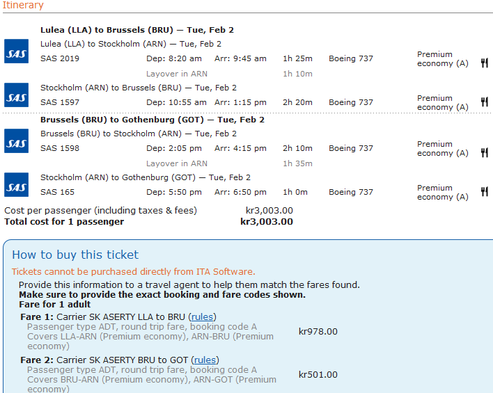 Det räknas som Open Jaw (Luleå-Bryssel, Bryssel-Göteborg).