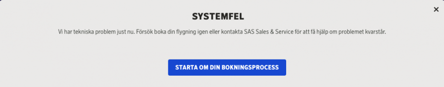 Kan meddela att det är samma fel även vid bokning av 2 eller fler passagerare...vilket piss, får detta vid bokning efter steg 3 (tillval) när jag vill komma till betalning: