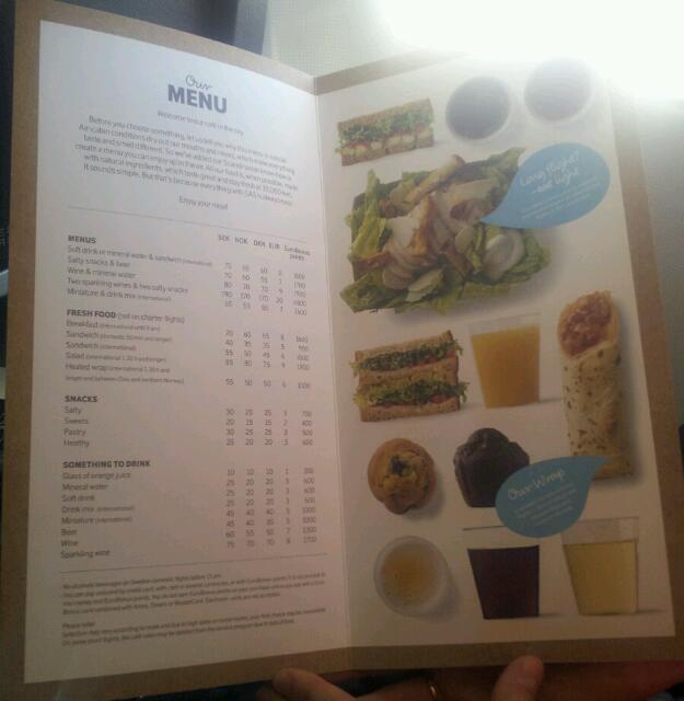 Menyn från dagens flight ALC-OSL. Mackorna fanns i ost eller ost/skinka, salladen som kyckling.