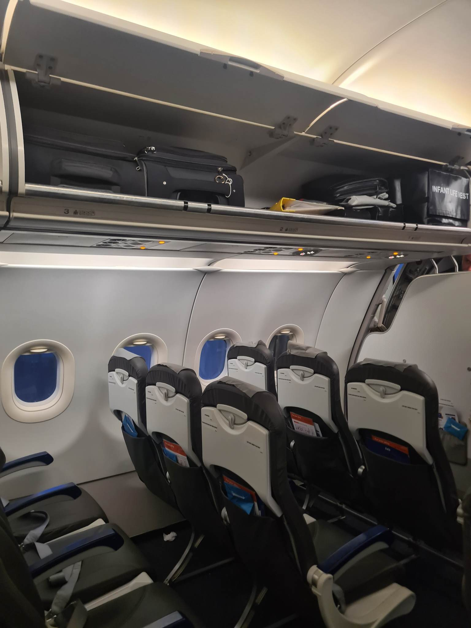 Man tog även upp första 3 raderna av PLUS overhead bins med crew egna väskor och infant lifevest m.m.