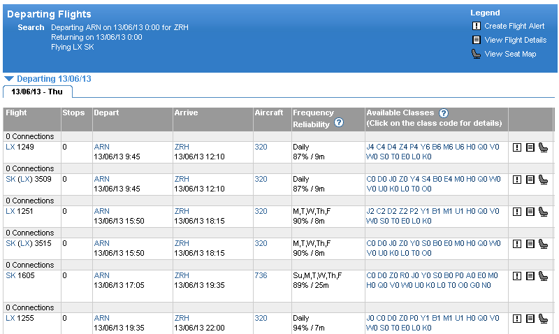 Billigaste bokningsklass som finns på SWISS (LX) är U klass och billigaste bokningsklass som finns på SAS (SK) är E klass. (Båda är i Economy class)