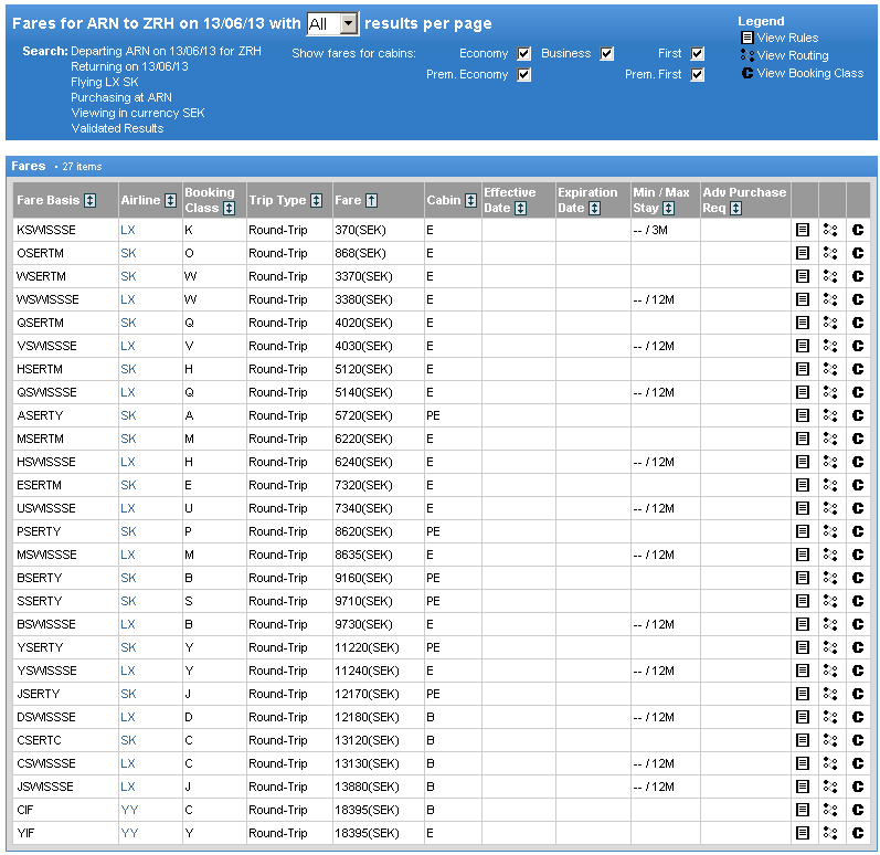 SAS Fare basis: ESERTM och SWISS Fare basis: USWISSSE har nästan samma priser.