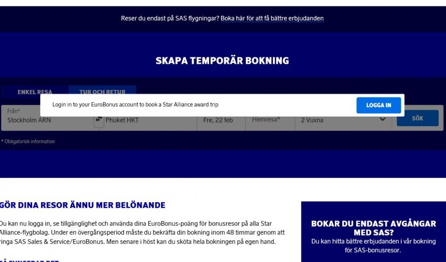 Är det någon som har haft problem att logga in på sidan där man skapar Star Alliance award trip? Jag får upp en "logga-in" ruta som inte går att komma förbi. Inget händer då jag trycker på "logga in" - detta oberoende av om jag faktiskt är inloggad sedan tidigare. Sidan fungerade för mig senast för en vecka sedan. Någon som har tips på hur man kan komma förbi detta?