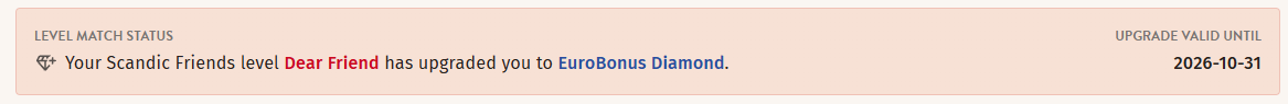 Min grace på SAS tog slut nu sista oktober, åkte ned till Dear Friend på Scandic och nu försöker systemen lista ut vad som gäller :) Verkar inte gå strålande än så länge. Gör jag samma sak via SAS så får jag att min Diamond ger mig Dear Friend hos Scandic :)