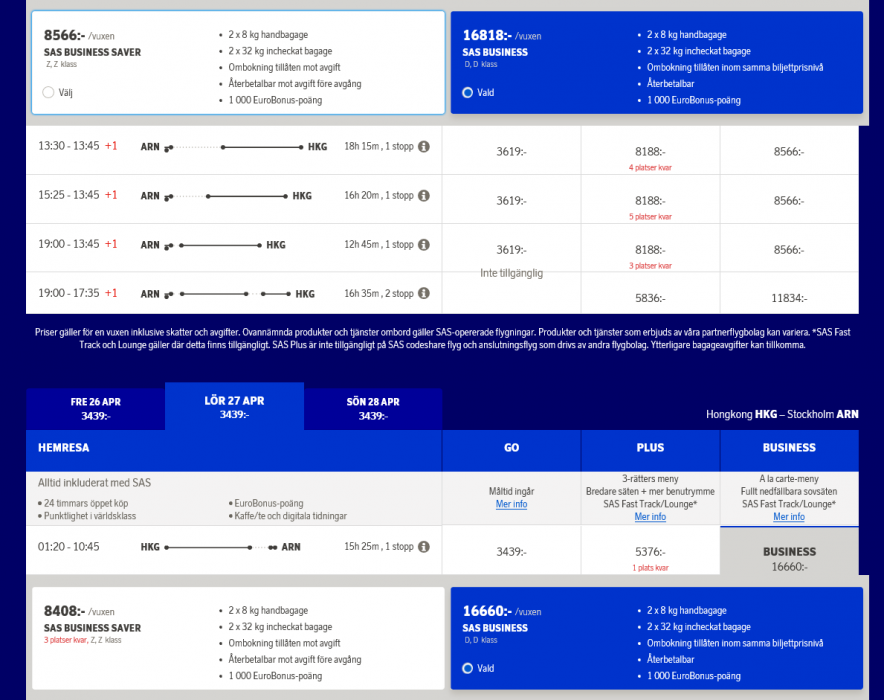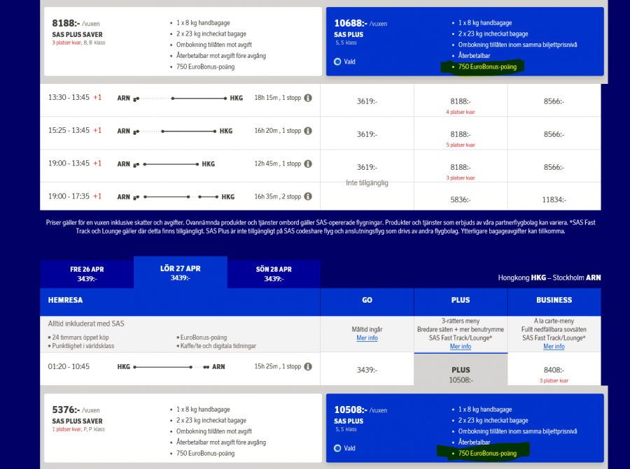 Är det bara jag som inte får ihop detta? Kollade datum i April till Hong Kong och där är även Flexibel Plus nedsatt rejält. Skulle inte sänkningen enbart gälla oflexibla biljetter i GO-class till Asien och USA?? Samma sak för flexibel Business Class. SK-IT? Håller de dessa nivåer kan vi prata svårt att flyga in EBG.