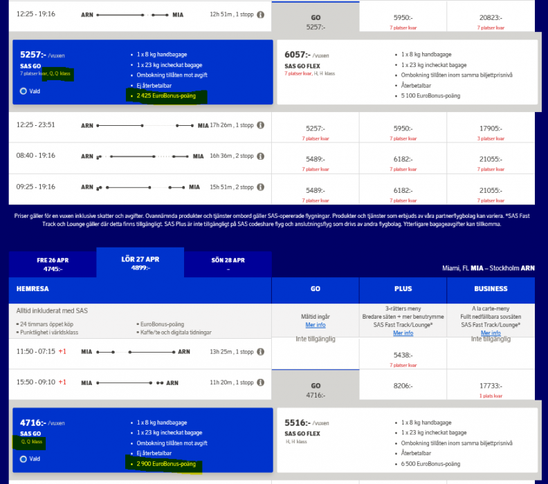Ja, bokningsklass verkar ha betydelse (än så länge) Q-klass ger 2925 poäng, V-klass ger 2650 poäng, W-klass ger 2425 poäng,samtliga tillhör samma Fare Family (SAS Go). Såg också att detta inte är konsekvent för när jag testade en annan bokning gav Q-klass 2425 poäng. :confused: Ett annat exempel illustreras nedan. Den skarpögde ser att trots att det är Q-klass i båda riktningarna för bägge flygningarna så tjänar man olika poäng.