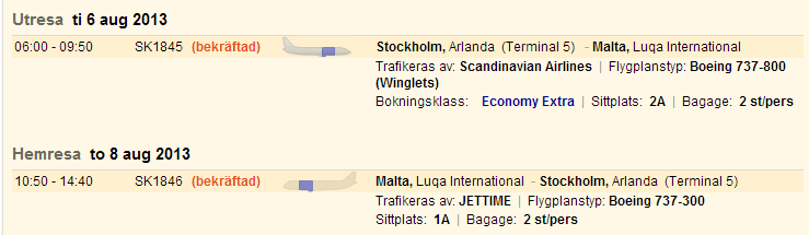 Tommy: Du har en flygning daterad till 6 augusti. Jag antar att du tog skärmdumpen ganska nyligen? Eller är det från ett mail INNAN juni? Det är ju annars lite svagt av SAS att fortfarande skriva Economy Extra...