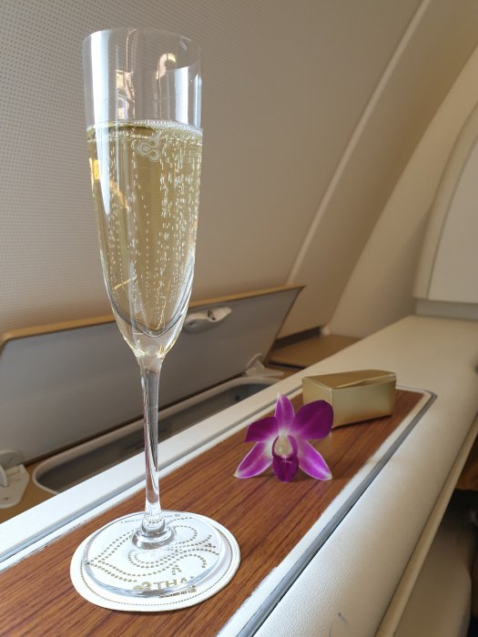 Ombord nu och det är mer eller mindre fullt i First. Lite dompa och pralin i väntan på avgång...