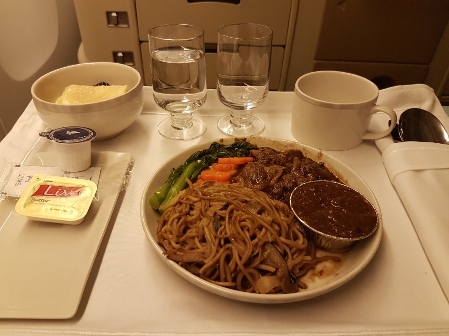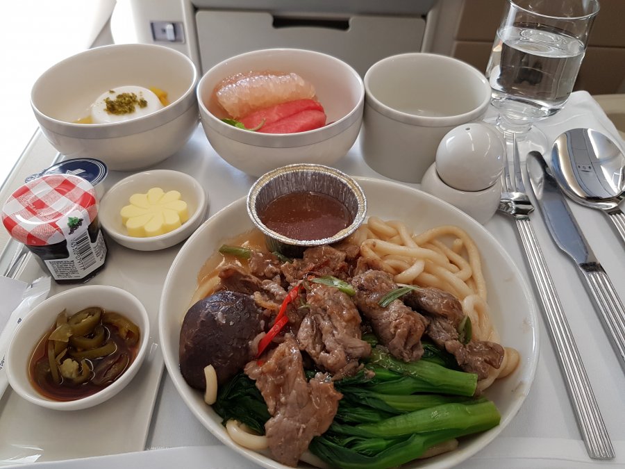 Efter att vi startat börjar matserveringen direkt och blir lite förvånad att menykortet ser lika dant ut som det jag fick i First, det är dock annan mat på vägen tillbaka. Serveringen sker på samma typ av bricka och det är väldigt effektivt att få ut maten snabbt. Det fanns 3 olika varmrätter att välja på och jag valde nudlar med biff. Vid det här laget var jag inte direkt sugen på mer alkohol och ber om Coca Cola. Flygvärdinnan ser ut som ett stort frågetecken, försöker upprepa mig att jag vill ha en soft drink och hon kommer tillbaka med en vinflaska. Gör jag mig inte förstådd eller är min engelska så dålig. Upprepar mig ytterligare en gång att jag vill ha Coca Cola om de har och hon pekar på vattenflaskan. Vid det här laget vet jag inte vad jag ska tro men frågar om de inte har någon form av soft drink att erbjuda och först nu faller polletten ner. Det tar dock ett tag innan min cola serveras och det är bland de minsta glas med cola jag fått som dessutom var fyllt med is.