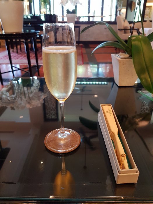 Kul med ett annat typ av plan från Singapore Airlines. Denna A330 har dock identiska stolar som den 777-300 jag åkte med dagen innan. Det är dock betydligt högre kvalité på skärmen. Innan start så blir det lite champagne och på denna flygning så har de lite större menyer ombord som sammanfattar allt de erbjuder. Tyvärr så glömmer jag ta med mig dessa så har inte något minne av vad som erbjöds mer än det jag tog.