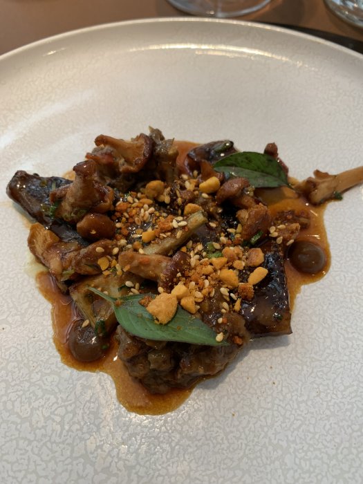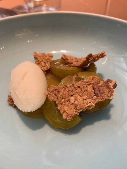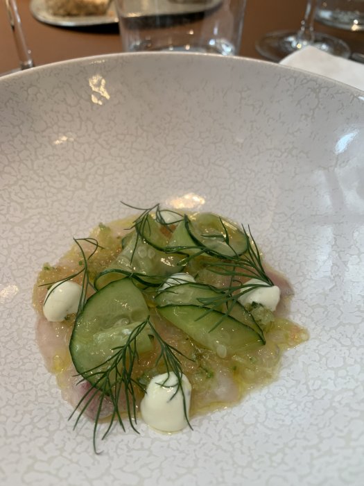 Maten denna lördagskväll var minst lika vass, oerhört vacker och lagom innovativ. Det enda störningsmomentet är all denna kringförsäljning som ska ske - bättre vin, ost, vin till ost, champagne (annars är det vatten som gäller till de åtta snacks som först serveras...), kaffe och kaffegodis osv osv.