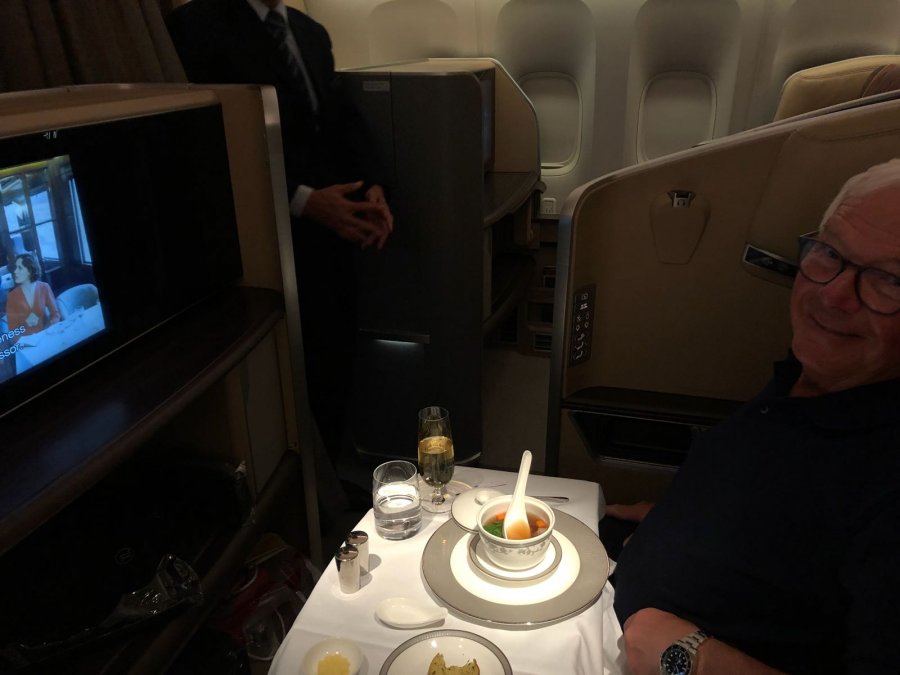 Ombordstigningen gick smidigt och vi fick gå ombord först. Väl ombord hade vi hela första klass kabinen för oss själva. 1A, 1C, 1D och 1F. Vi satte oss på 1C och D för att sedan använda A och F som sängar. Vi hade kabinchefen anthony med 2 kollegor som skämde bort oss.