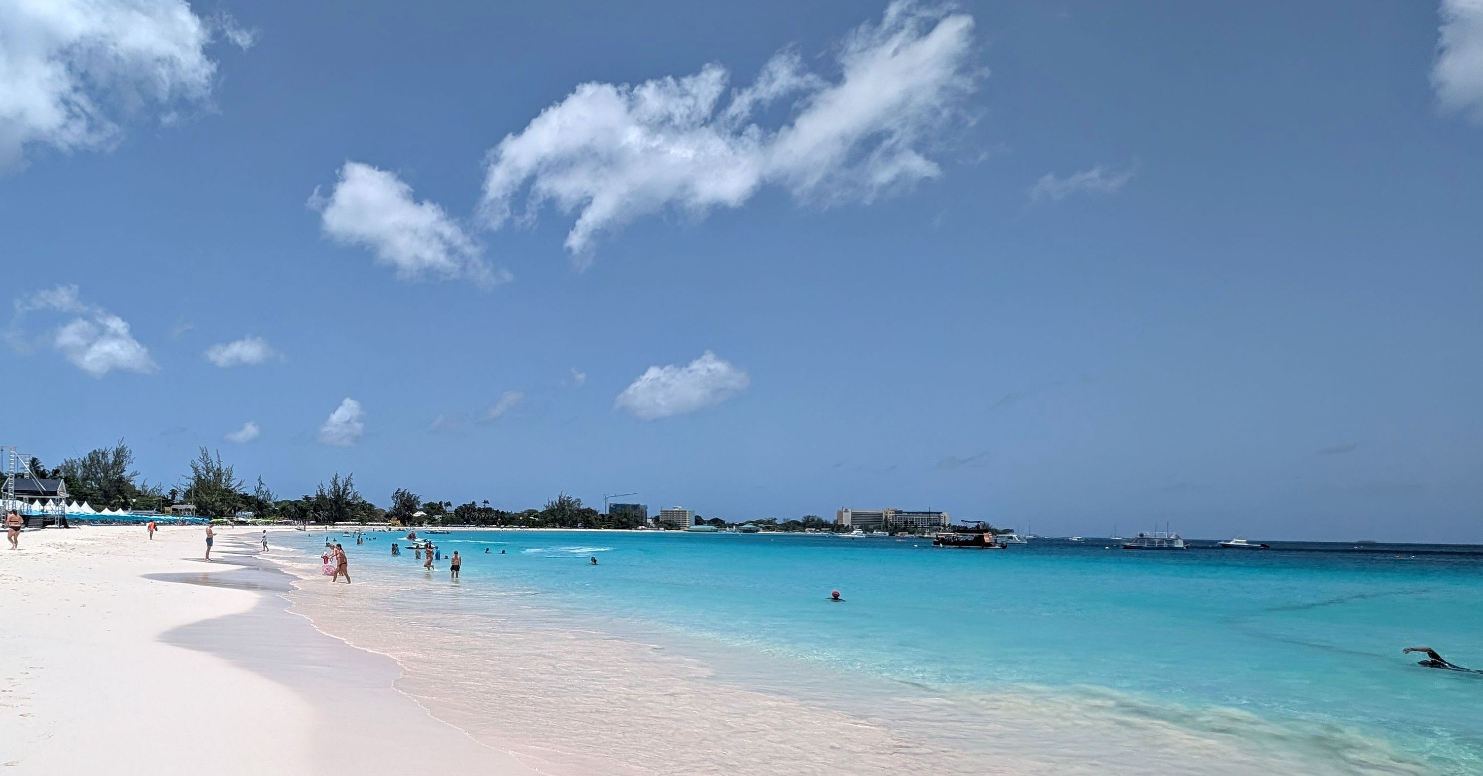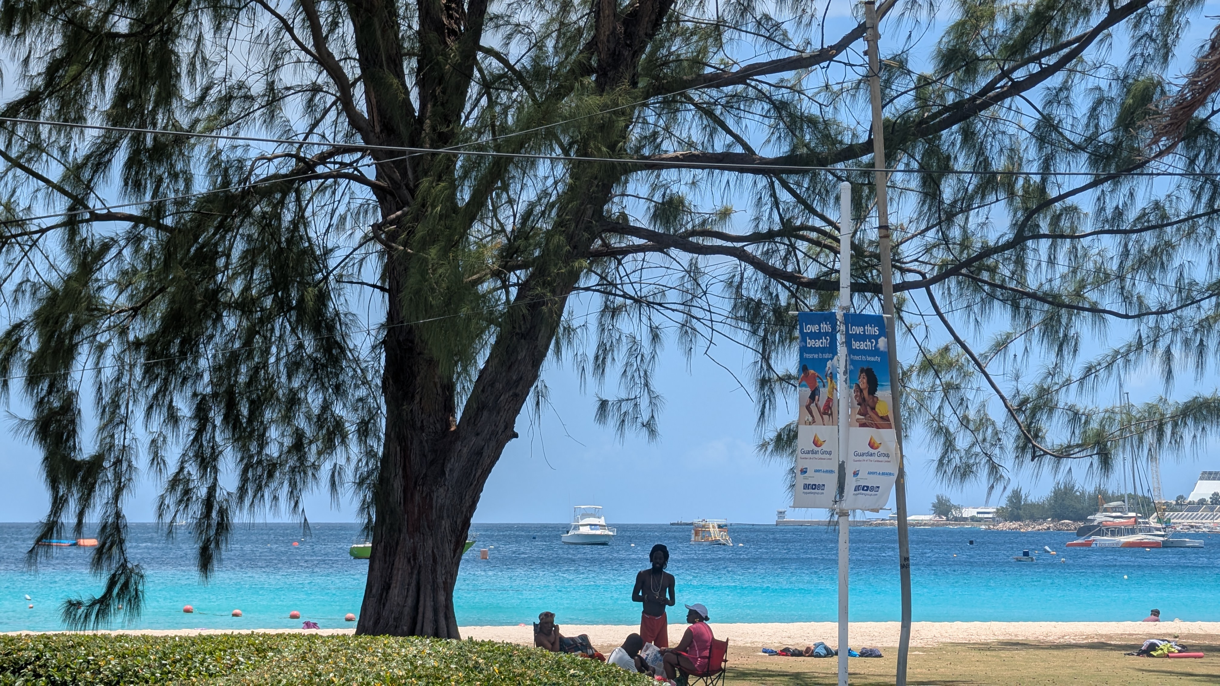 Barbados västkust är generellt sätt lugnare mht vind och vågor. Sydkusten, där vi bodde, var aldrig stilla, men ändå inga stora surfbryt. Enligt utsago är östkusten surfarnas häng, med hela Atlanten framför sig. Väl i Bridgetown var det givet att pinna över till Carlisle Bay, precis söder om Bridgetown. Denna bukt är som ett vykorts-motiv med starka kontraster mellan kritvit strand, turkost hav och knallblå himmel. Detta till tonerna av en Banks pilsner... Kan föreställa mig att det är en köttmur här de dagar det är kryssningsfartyg i stan.