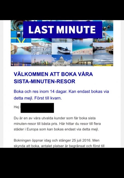 Du är en av våra utvalda kunder som får boka sista minuten-resor till bästa pris. Här hittar du resor till flera städer i Europa som kan bokas endast via detta mejl.