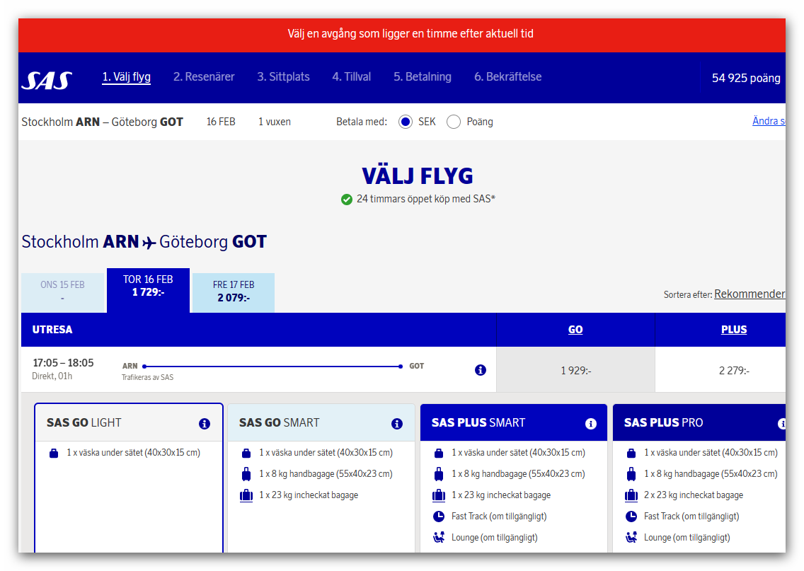 SAS har fördelen att de har en frekvent tidtabell på många destinationer och då är det synd att möjligheten att byta avgång är så komplicerad även vid flexibel biljett, särskilt om man behöver gå via affärsresebyrå och företagsavtal vid ändring alternativt köa till någon biljettdisk på flygplatsen.