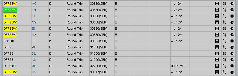 Hur/vart hittar du de här biljetterna? Söker på kvs och får bara fram DFFGBW som kostar EUR 4106...Ta t.ex. Atlanta som kostar nu 25 00kr inkl skatter och avgifter medan från ARN kostar en D-klass (billigaste uppgraderingsbara resa) 33 500kr inkl skatter och avgifter DFFSEW LH D Round-Trip 30580(SEK)