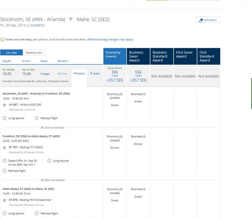 Du har inget Amex-kort så du kan spendera 150 000 kr på så att du kan få en voucher 2-4-1 och på så sätt göra resan i Business? Om du skaffar ett kort PRONTO hinner du kanske komma upp till 150 000 kr, i alla fall om du eller någon vän har en stor räkning som du kan betala med Betalo. Du kan själv söka din resa på Uniteds hemsida. Detta får jag tex upp med utresa den 30 sep, som @MartinH sa. Det ger i alla fall en Connection på 4 h 50 min i Addis Ababa, jag vet dock inte hur snabbt man tar sig in till staden?
