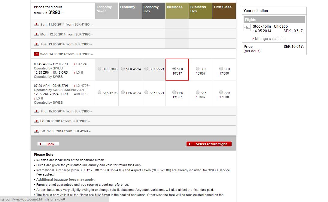 "Married Segments" är en favorit för Swiss där en marknad bara får ett antal platser som man kan sälja till varje pris. Ett exempel skulle vara att ARN-ZRH och ZRH-ORD visar annorlunda tillgänglighet. Om vi tar billigaste affärsklass "P" så skulle kanske ExpertFlyer visa om man söker dessa separat: