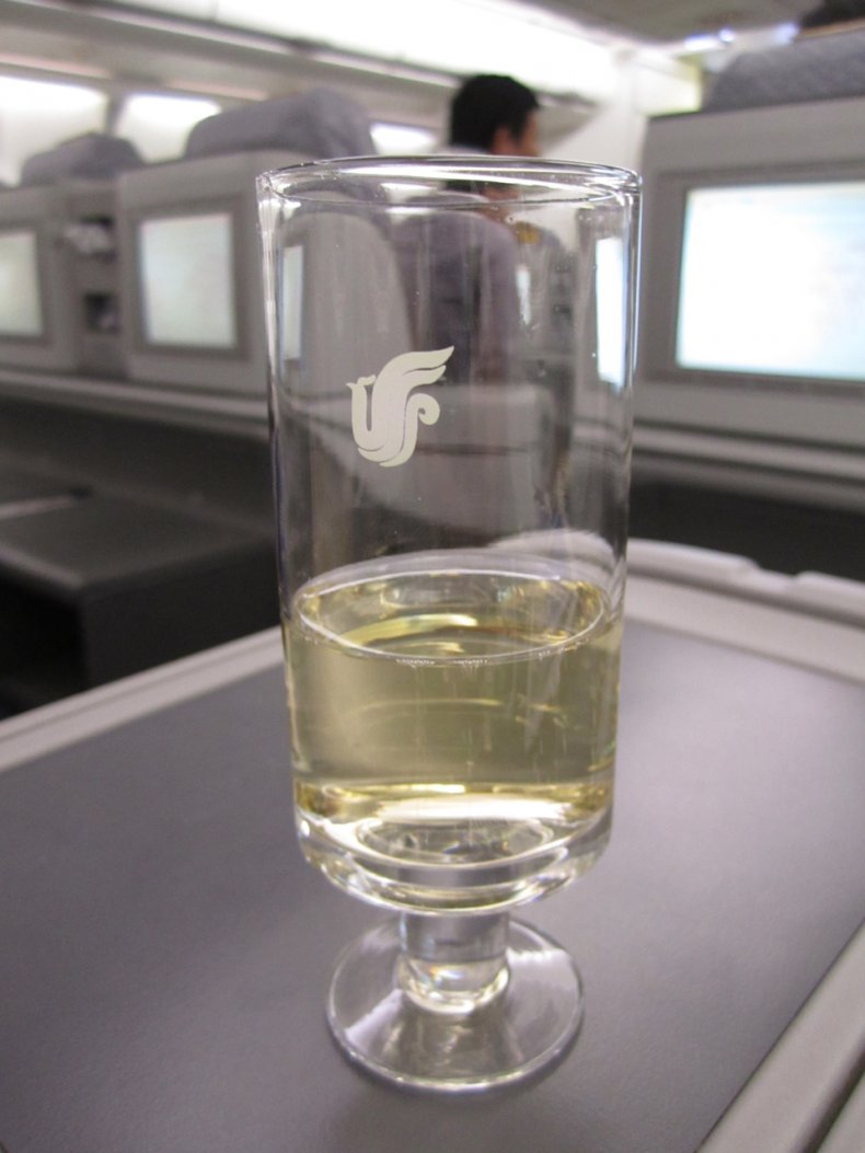 Beställt bubbel serverades omgående när vi kommit upp i luften och kapten släckt lampan för säkerhetsbältena och till den även skål med blandade nötter. En andra varm handduk erbjöds även.