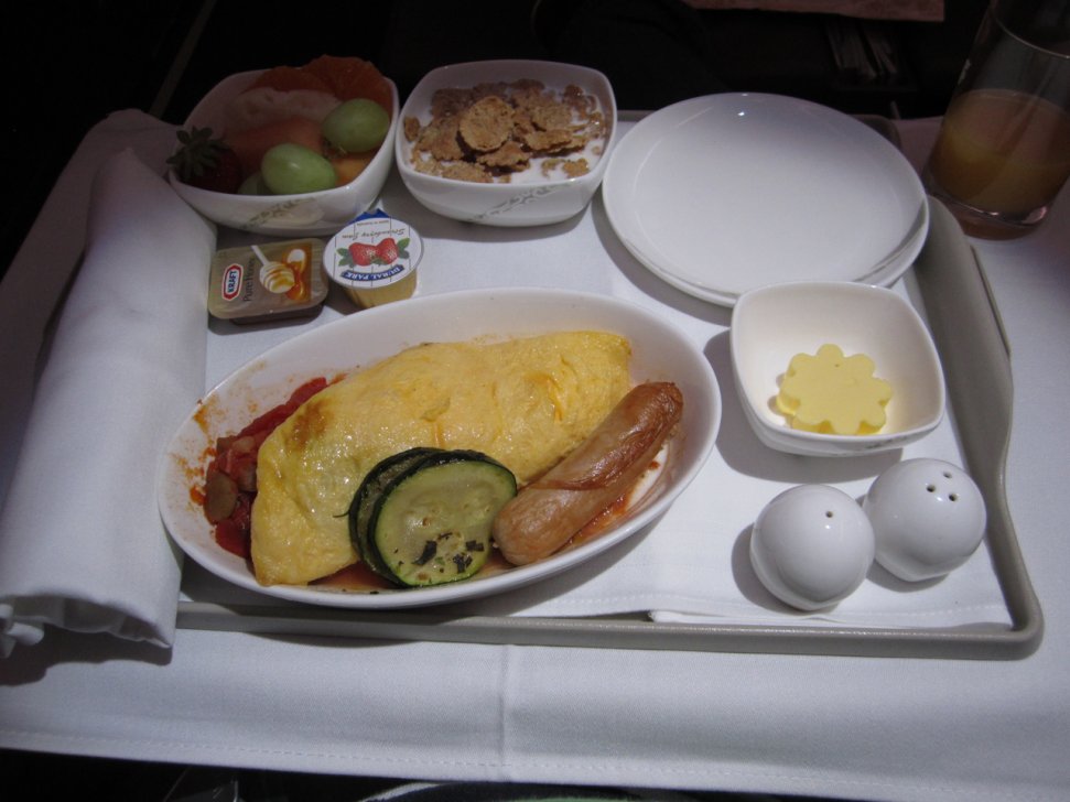 Vaknade igen gjorde jag när kabinen tändes upp, vid 7:00 australiensisk tid eller 4:00 kinesisk tid. Frukosten fanns i två varianter, kinesisk och västerländsk, jag valde det senare och fick en bricka enligt nedan.