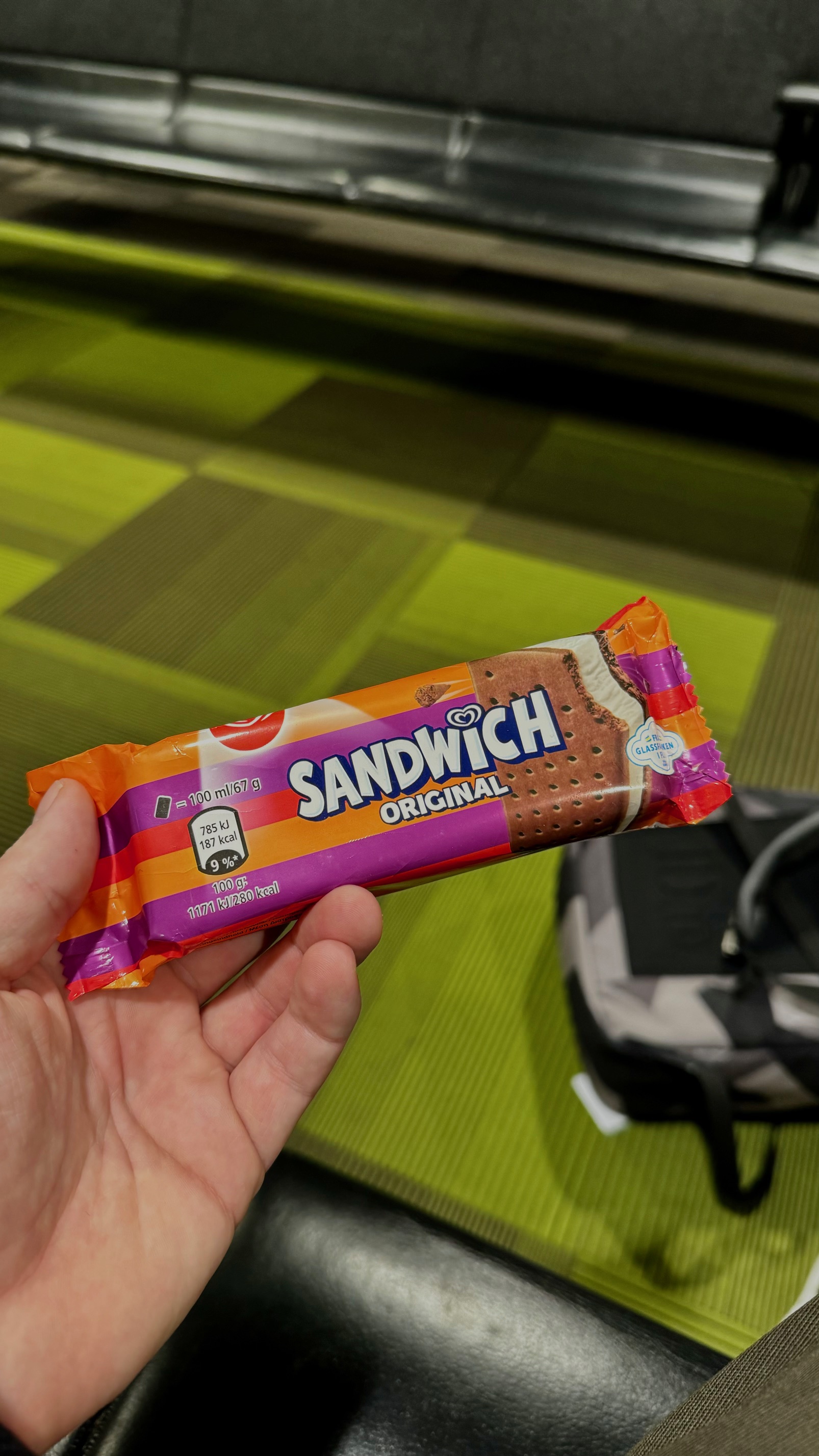 Grand finale, efterrätt. Glass och kolasås. Detta kan ni väl ändå inte misslyckas med? Jodå.. Vaniljglassen var snarare en isglass, men kolasåsen var åtminstone god. Överlag, det sämsta i matväg någonsin ombord ett flygplan. (Inte inkluderat den kalla pirogen SAS serverade i PLUS för ett tag sedan...) Drycken var det absolut inget fel på ska tilläggas.