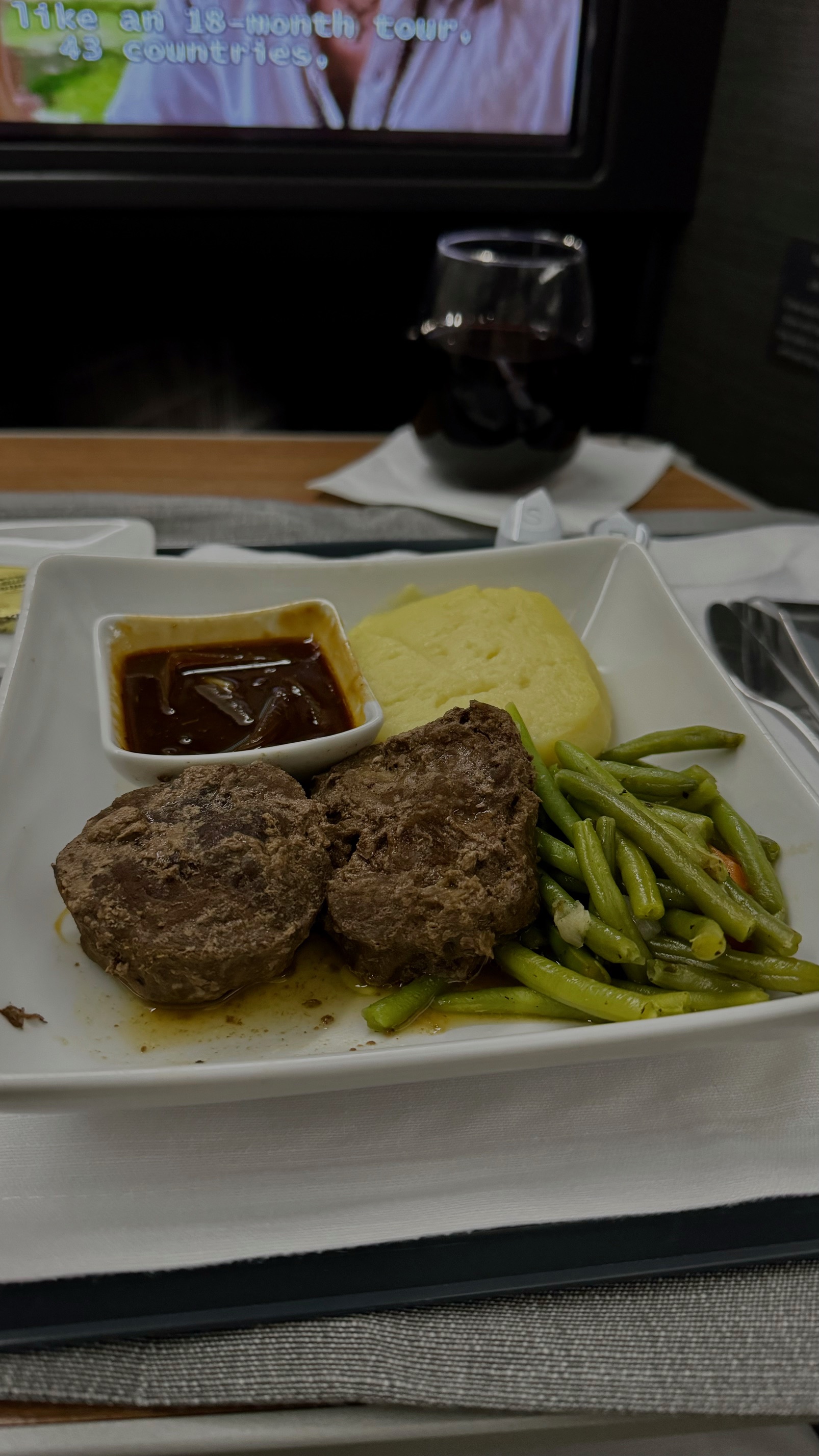 Till huvudrätt valde jag en beef brisket. Till detta serverades potatismos, haricot vert, morötter och portvinssås. Köttet var senigt och gick knappt att dela, än mindre att tugga. Potatismoset klumpigt och såsen samt grönsakerna var väldigt smaklösa. Utan tvekan den sämsta huvudrätten jag ätit i business class.