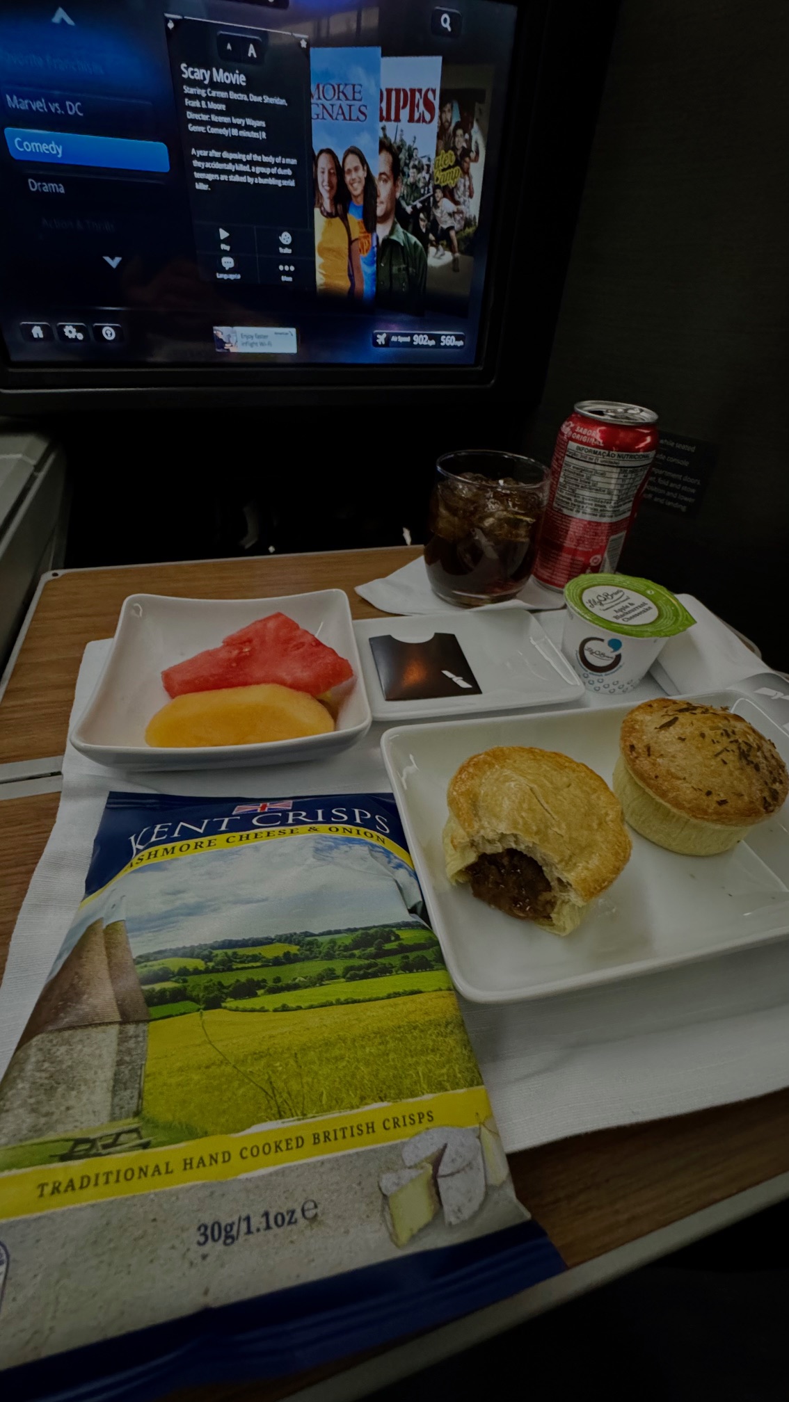 Efter lite välbehövlig sömn väcktes jag för lite pre landing snack/mat. Bestod av fyllda muffins (?), en med kött och den andra av svamp. Till detta serverades lite chips och frukt. Återigen inget att hänga i granen smakmässigt. Även stor skillnad emot vad United serverar innan landning. Då fick jag en burgare!