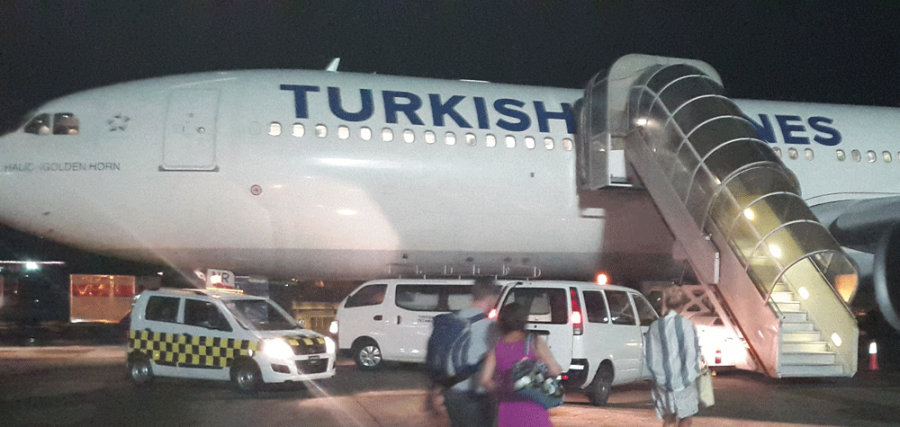 Det skulle dröja ca 30 (!) minuter innan de fick fram en buss, under tiden flöt blippade och ej blippade pax ihop till en stor svettig massa. Gatepersonalen passade för övrigt på att lämna platsen under detta kaos. När sen en buss dök upp så behövde man gå igenom allas boarding pass en andra gång. Väl på planet visade det sig vara gammalt och slitet, betydligt sämre än TK1796 nio dagar tidigare. Business visade sig i princip vara Eco med seatblock, i trång 3+3 config. I väntan på att lyfta tilläts passagerare att springa fram och tillbaka på toaletterna, vilket gjorde att personalen hade stora problem med att räkna in alla. Ytterligare 30 minuters väntan på marken vidtog innan vi äntligen var i luften.