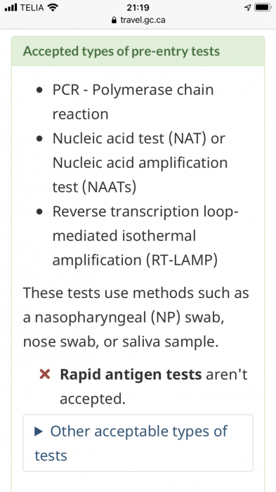 Kanada kräver sedan 1/12 test. Antigentest godtas ej. Kontrollerades noga.