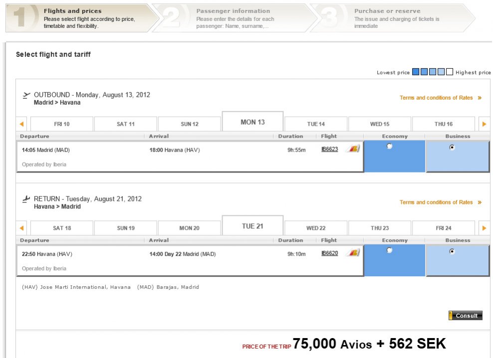 Exempel 1. MAD-HAV i Business Class