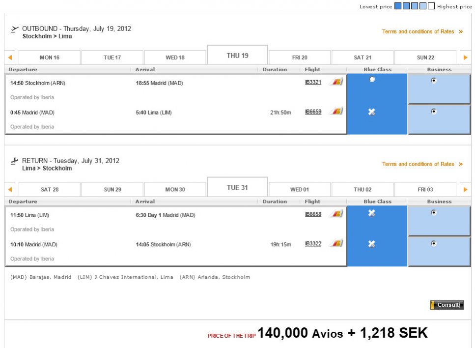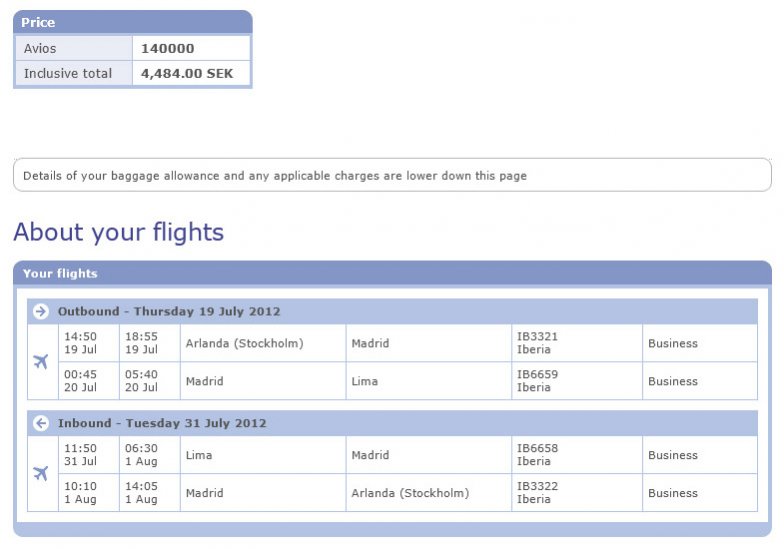 Exempel 2. ARN-MAD-LIM i Business Class