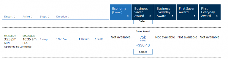 Den första sträckan är ARN till Peking. Via United får jag fram alternativ i Business med Lufthansa, Swiss och Austrian. När jag väl försöker boka detta finns det ingen tillgänglighet på dessa. Försäljaren menade att på sträckan till Peking endast finns med Air China.