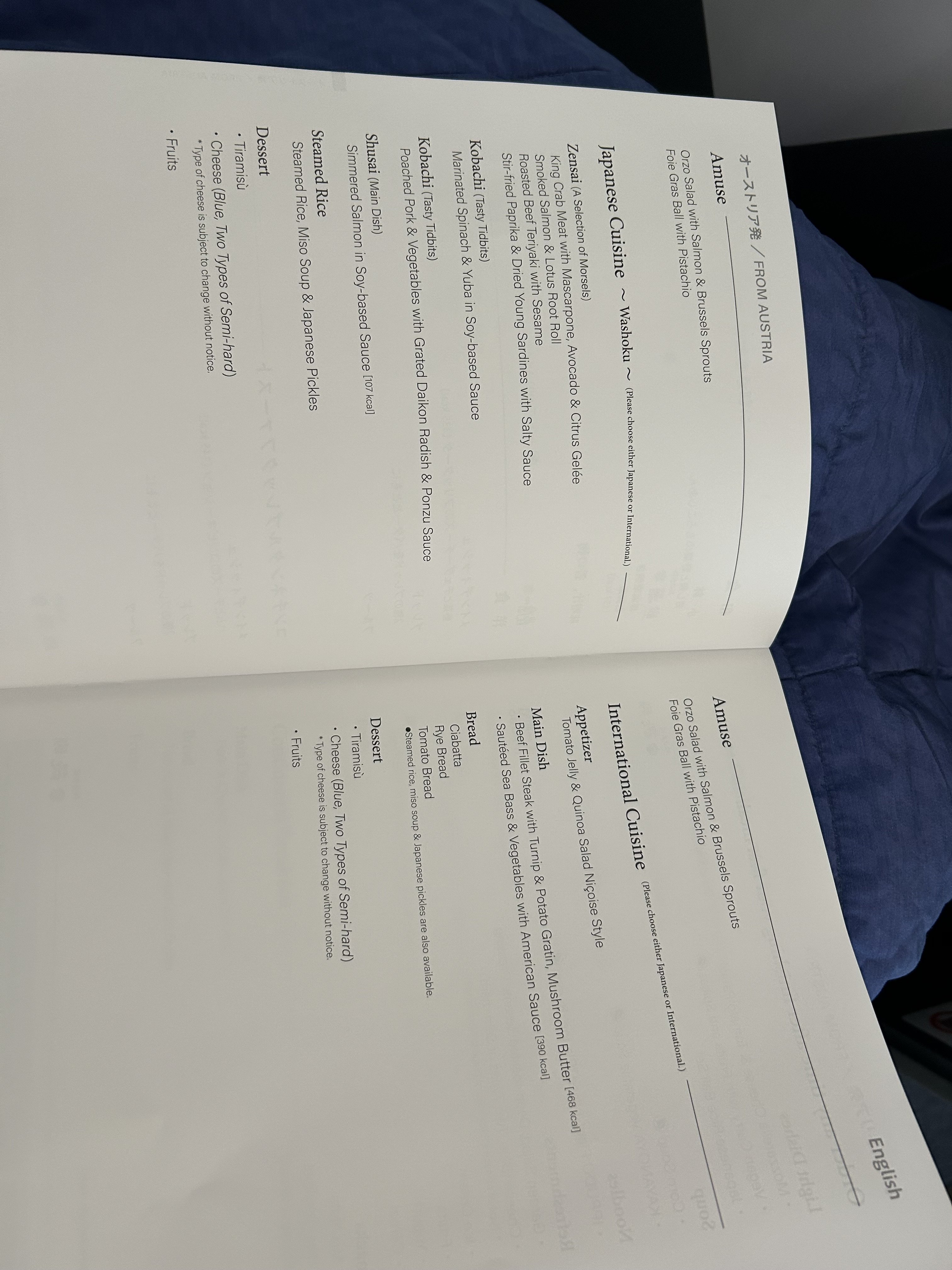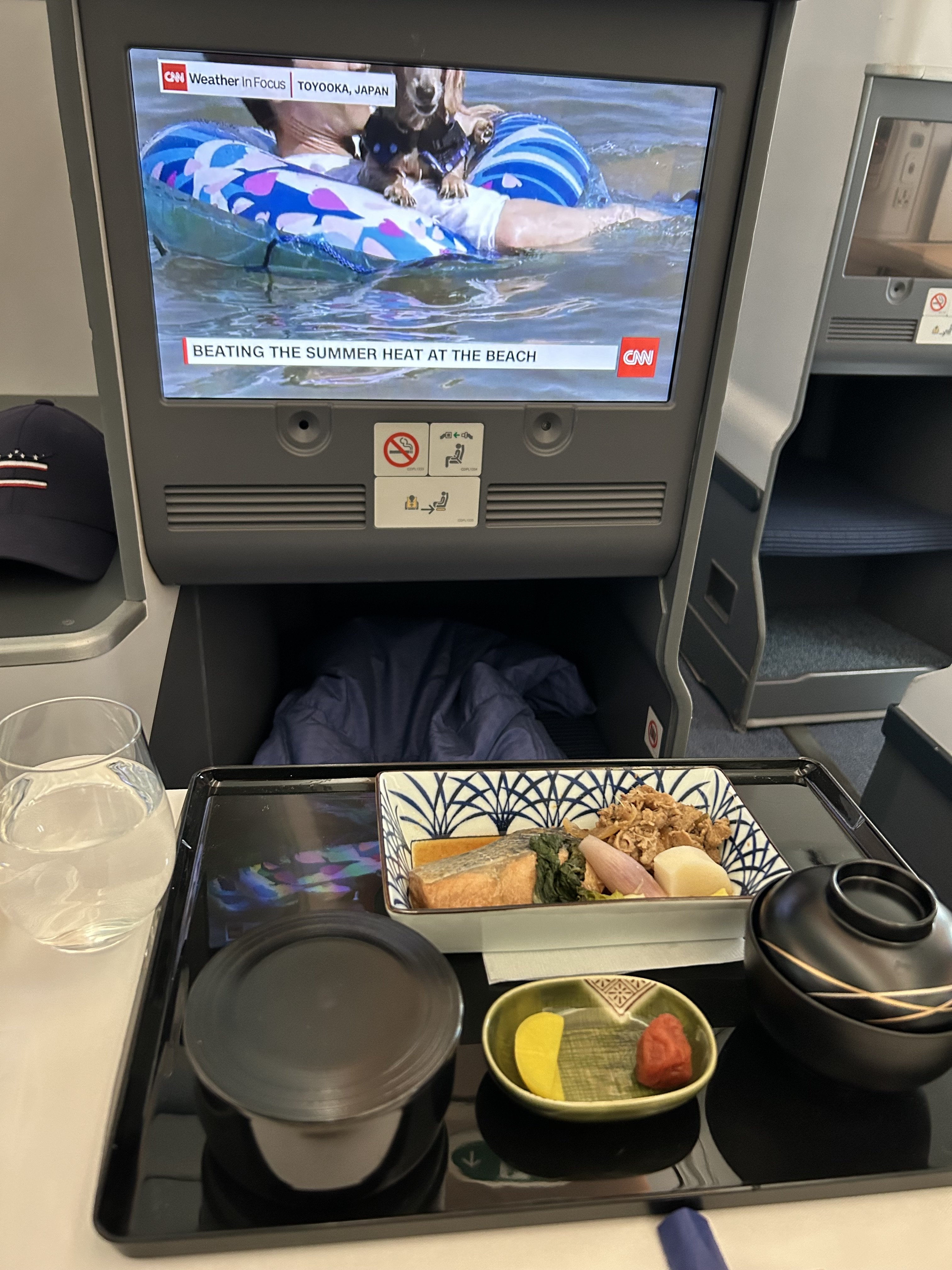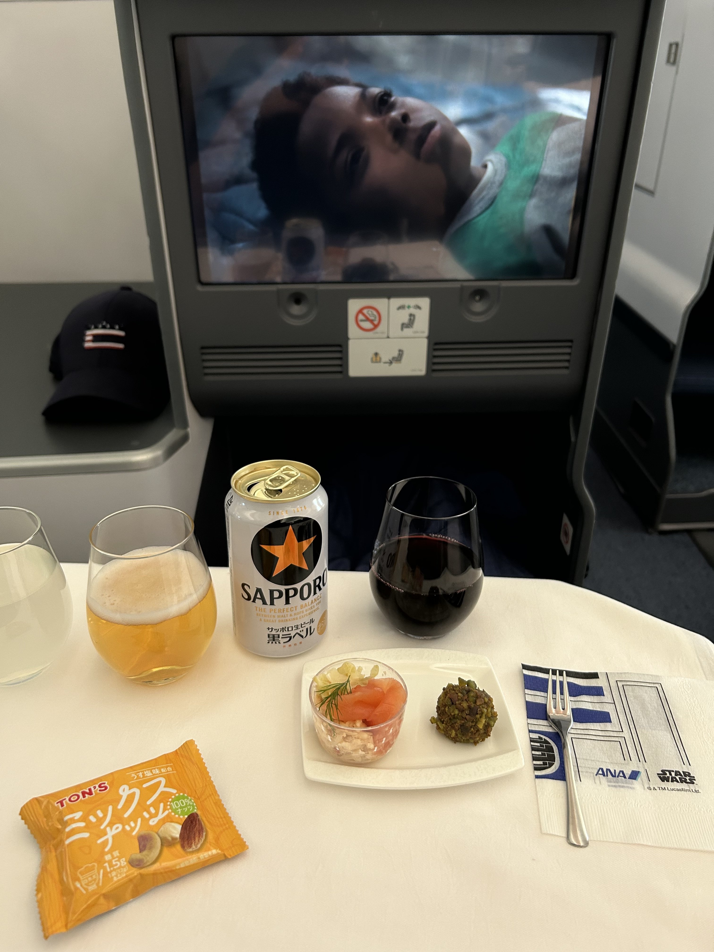 13:48: Tog 1,5h innan flyget kom iväg och ingen serving innan dess så jag tror att man kunde mäta mina magkurr med decibelmätare från marken. Många spännande frågetecken här. Verkar vara ANA med Star wars-tema; C3PO läste upp säkerhetsreglerna och värdinnorna springer runt med Star wars-förkläden. Dom har lite tufft med engelskan (”Recommended pairings to the food?” Pekar då på menyn. Tack!).