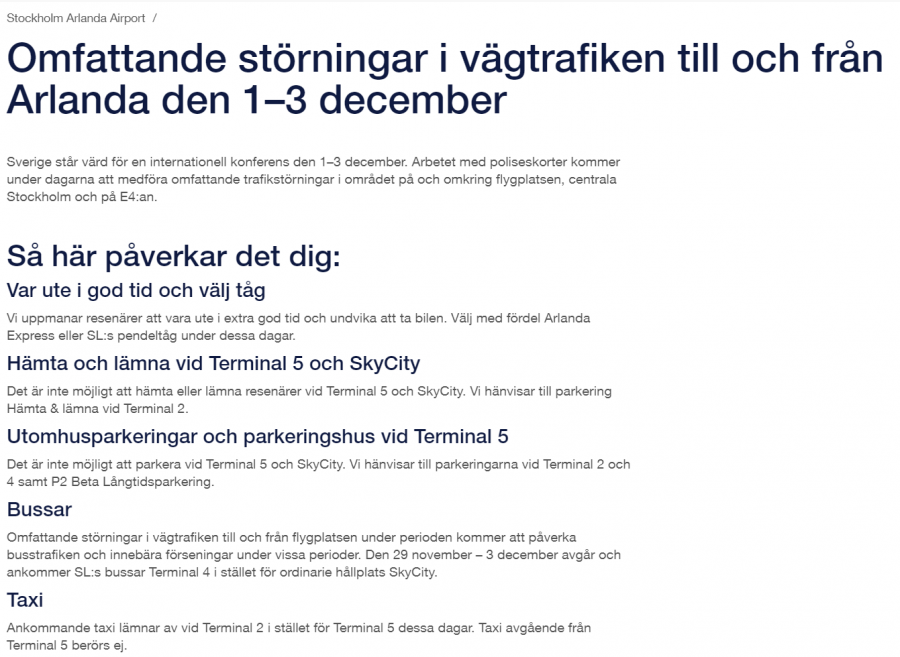 Heads-up för er som ska till eller från Arlanda onsdag-fredag denna vecka Omfattande störningar i vägtrafiken till och från Arlanda den 1–3 december | Stockholm Arlanda Airport