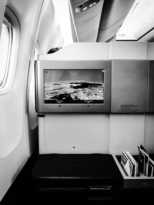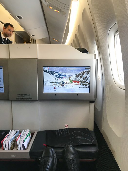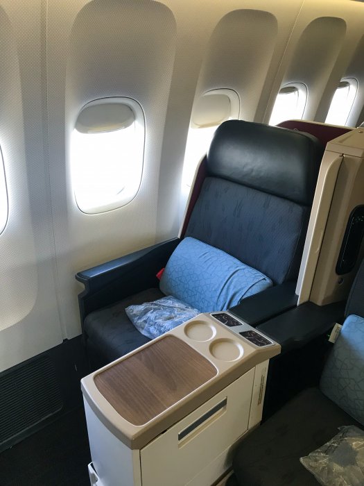 Seat 3K i den främre Business Class-kabinen. I sista minut satte sig en äldre farbror på gångsätet och han vägrade flytta sig till en egen rad trots att kabinen var i det närmaste tom. Jag valde därför att förflytta mig till 5K i den bakre delen av kabinen.