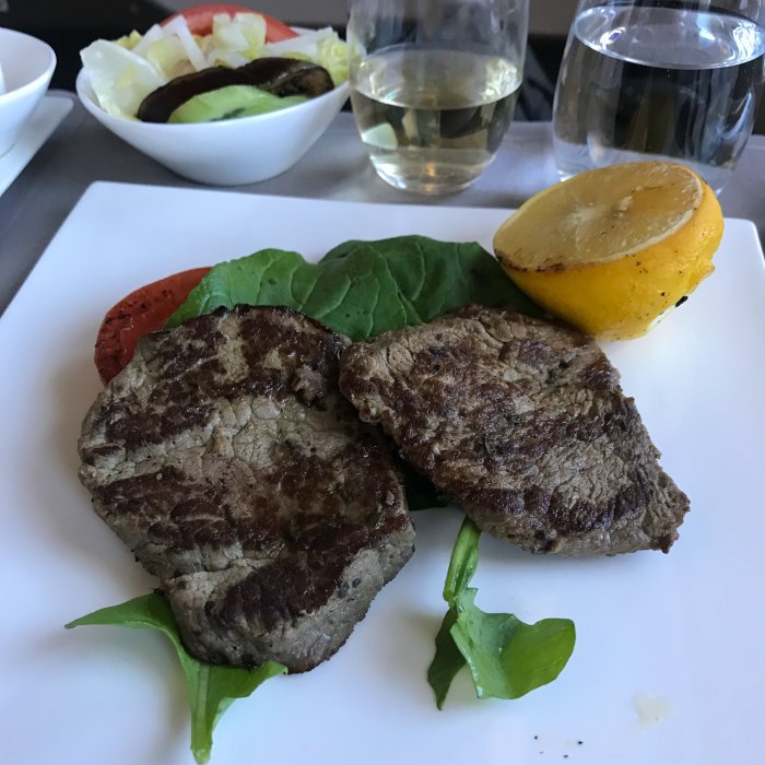 Varmrätten: Steak&Salad. Två torra köttbitar och några salladsblad. En av mina sämsta varmrätter ombord på Turkish Airlines. Tur att jag tog två förrätter.
