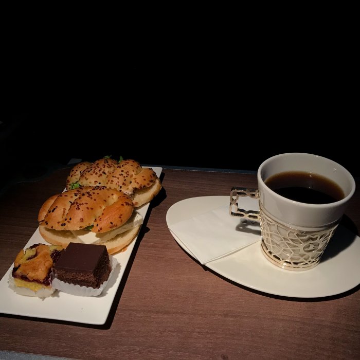 Ett lättare mellanmål serveras mitt i flygningen. Smörgåsar med kyckling och vitost, samt petit fours bestående av blåbärspaj och Sachertårta.