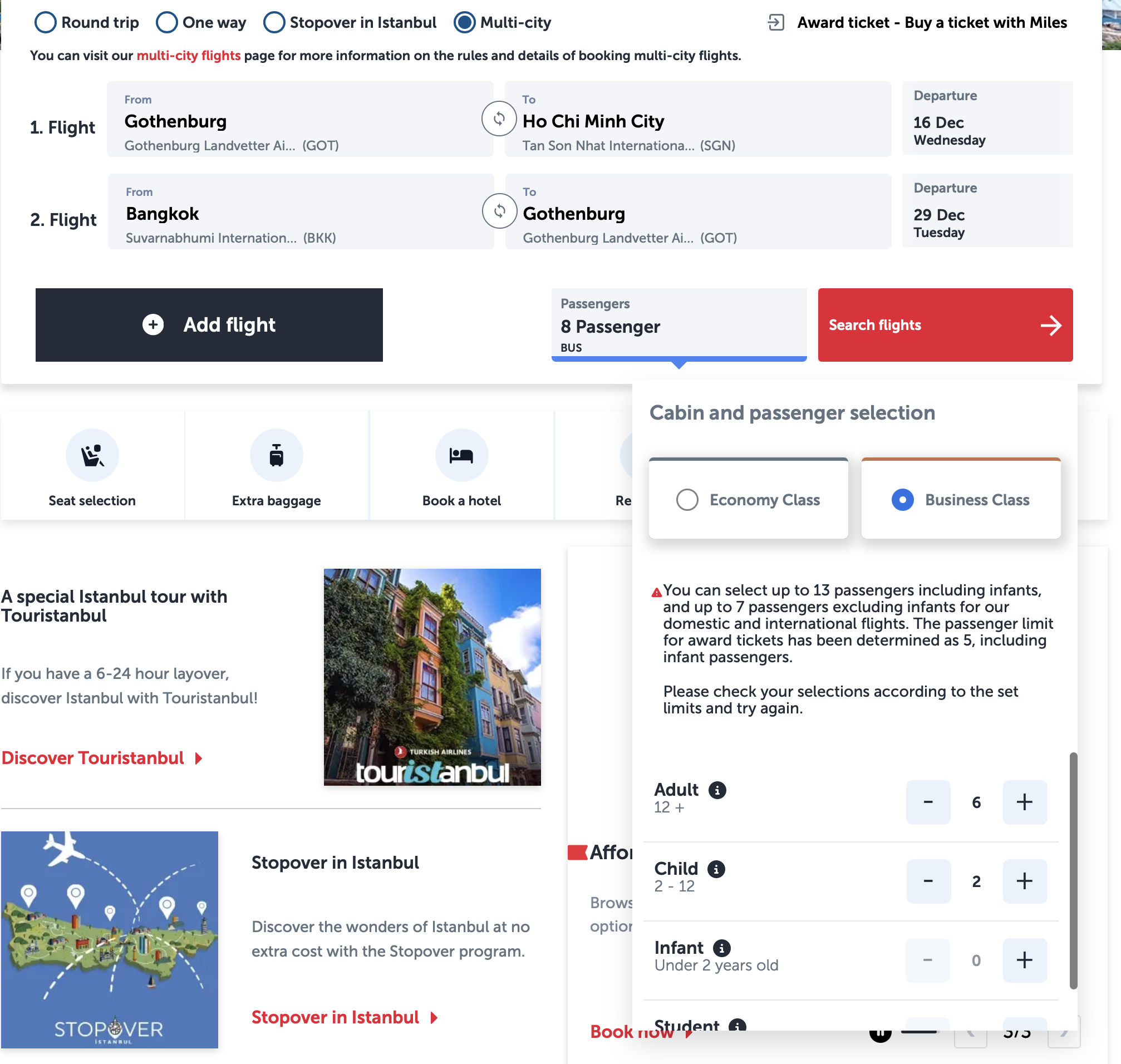Vi planerar en resa till Asien nästa vinter och är 8 personer i två familjer (6 vuxna + 2 barn). Tanken är att flyga Turkish Airlines GOT–SGN och BKK–GOT som multi-city (se bilderna).