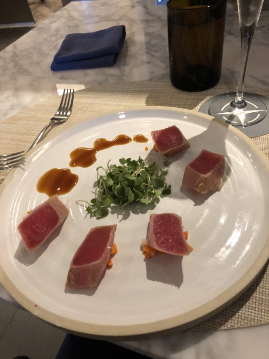 Hann med att testa skumpa, tonfisk och rib eyen.