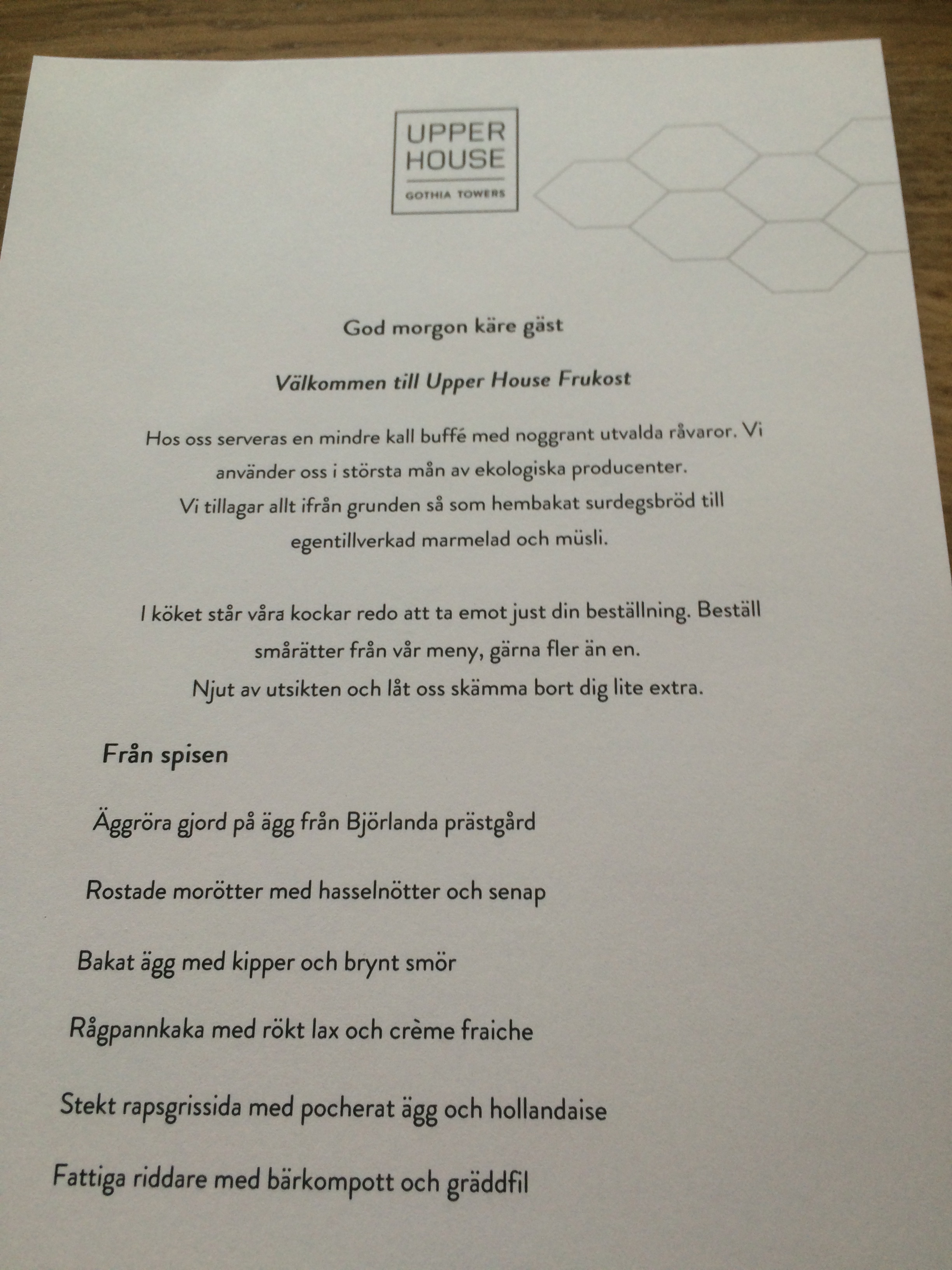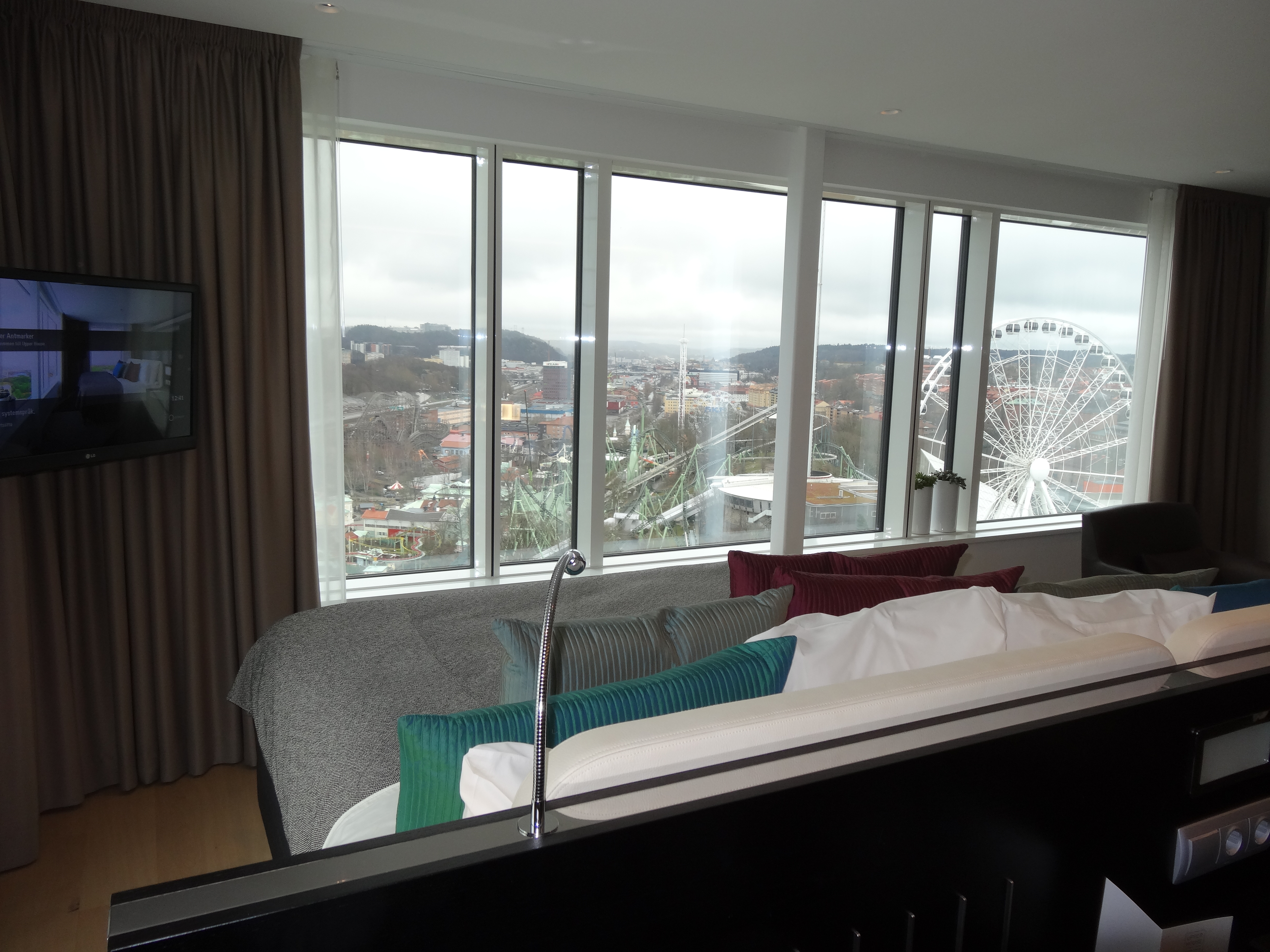 Vi blev serverade en fantastisk frukost, en lite buffé och några rätter a la carté som kunde beställas utifrån menyn. Matsalen har en underbar utsikt från bordet utöver stan. Utsikten från toaletten är över Liseberg