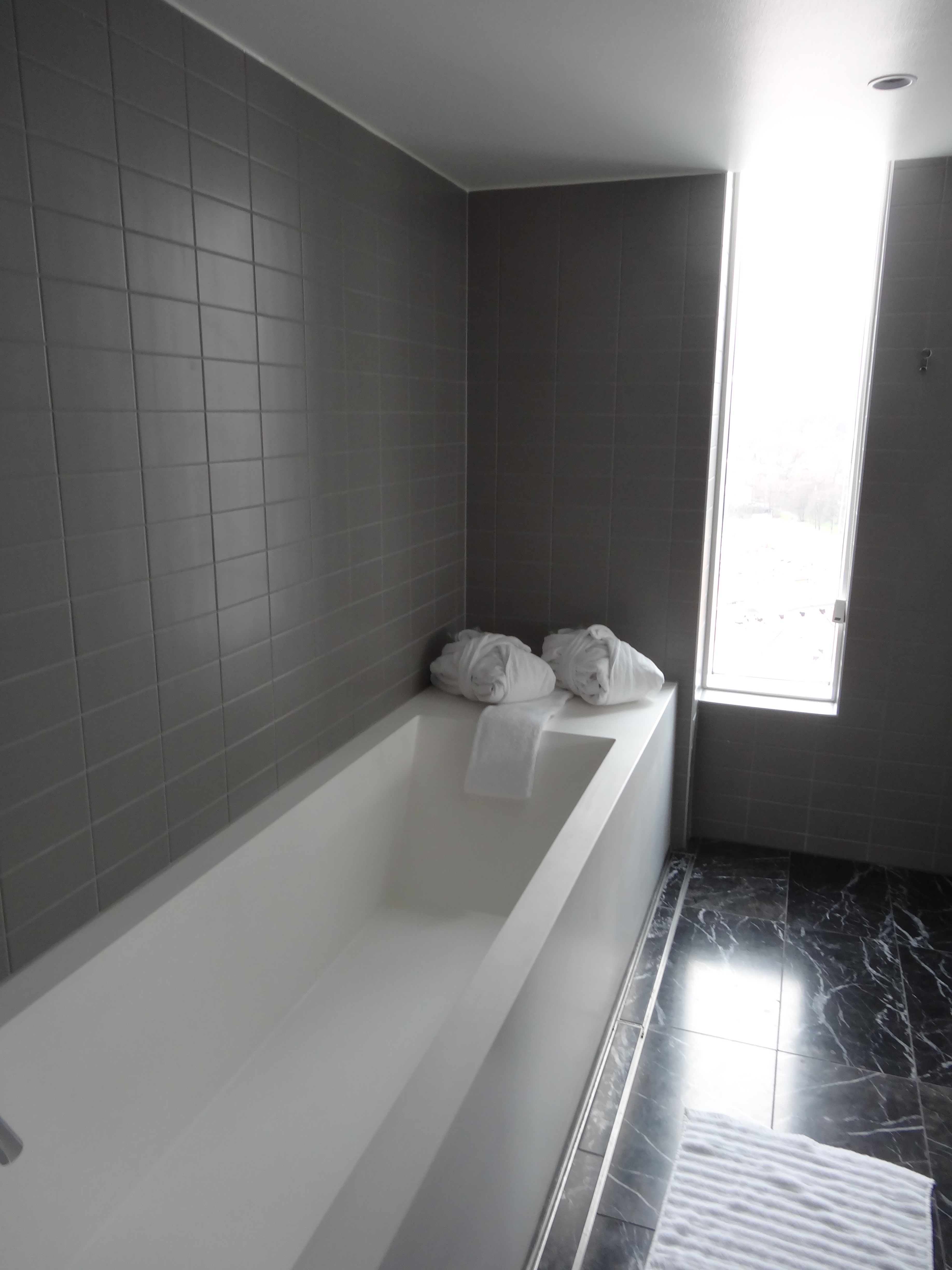 Vi fick ett hörnrum på 24e våningen, vi hade bokat ett Deluxe-rum, 48 m2 stort, med stora fönster åt två håll och en drygt 4m2 stor säng med en massa kuddar, tom en ljudkudde.