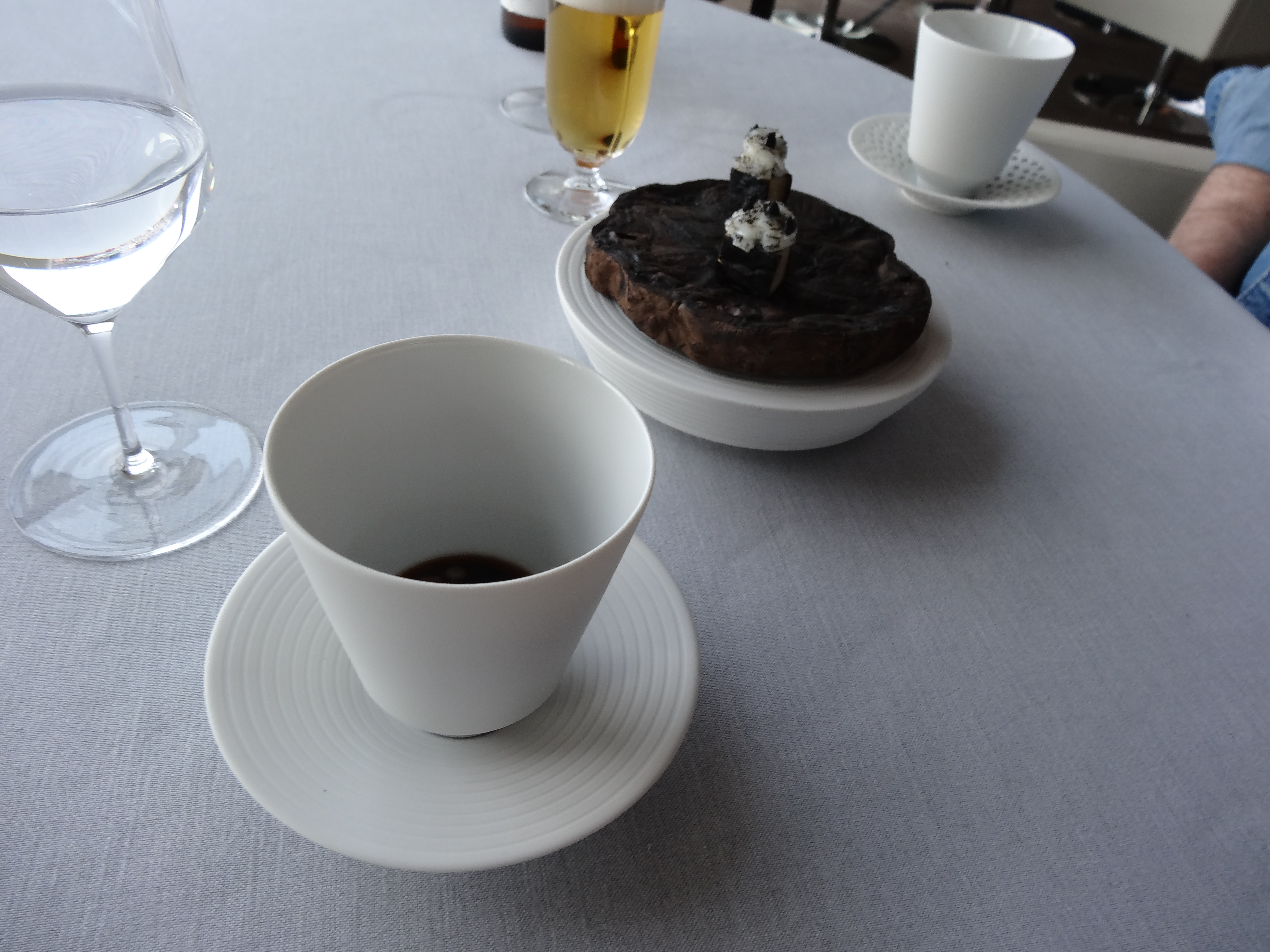 · Tunnt hyvlad champinjon med champinjonskräm och mördegsstrut med kokt långahuvud och ramslök. (Struten så ut som en liten, liten glass)
