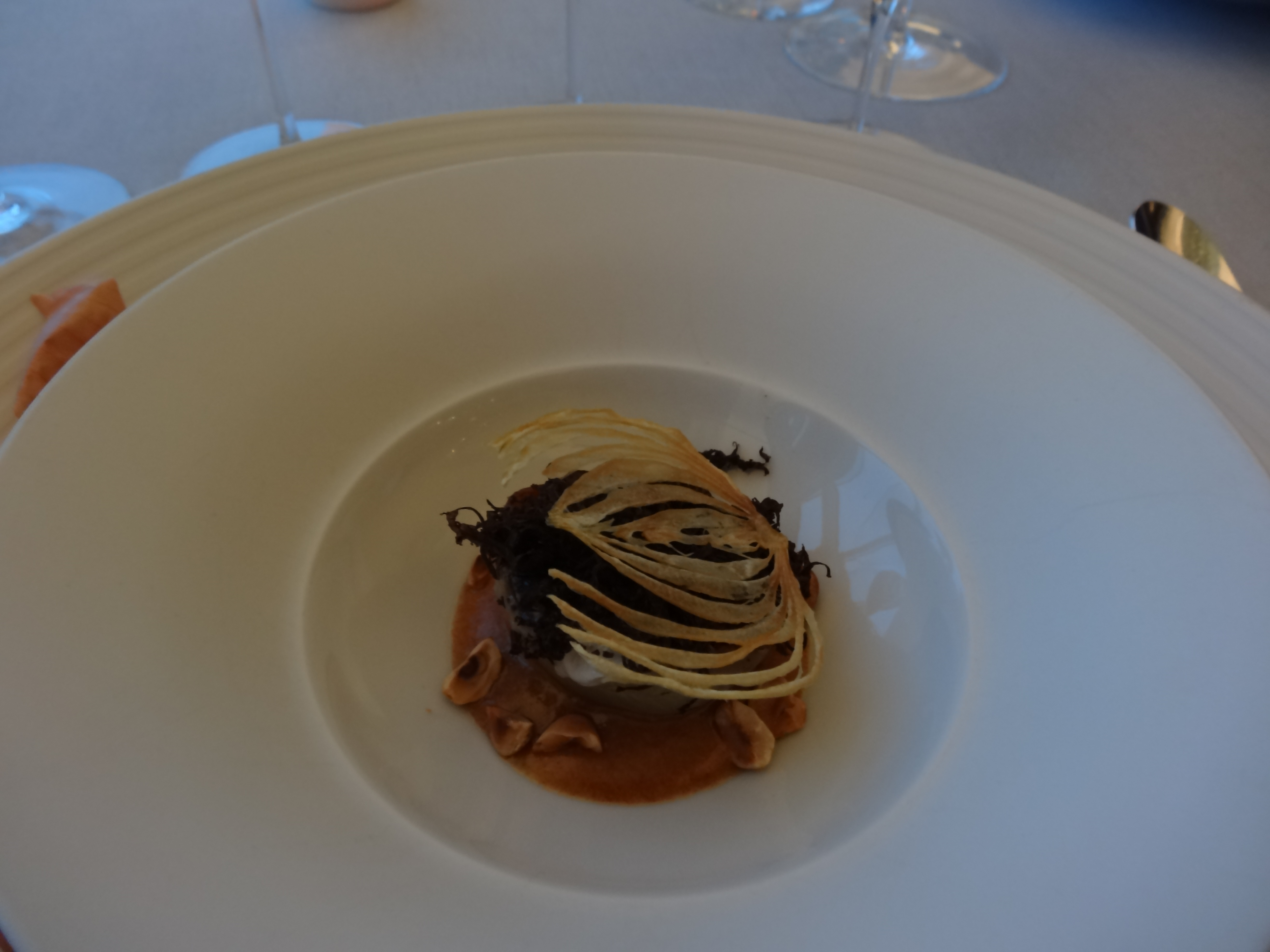 · Lökreduktion med hasselnötter, grillad lök med mycket hyvlad tryffel och en tunn skiva friterad lök.