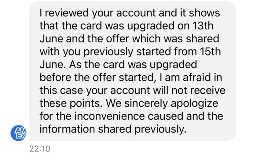 I reviewed your account and it shows that the card was upgraded on 13th June and the offer which was shared with you previously started from 15th June. As the card was upgraded before the offer started, I am afraid in this case your account will not receive these points. We sincerely apologize for the inconvenience caused and the information shared previously.