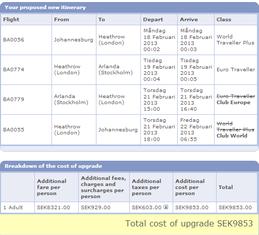 Detta var nyheter för mig - har aldrig fått pris på multi-leg tidigare, utan alltid behövt ringa (det som tråden handlade om från början delvis). Uselt pris förvisso, men betyder det kanske att de håller på att få ordning på lösningen? Noterbart är att det bara funkar om jag vill uppgradera både ARN-LHR och LHR-JNB, annars får jag det vanliga felet.