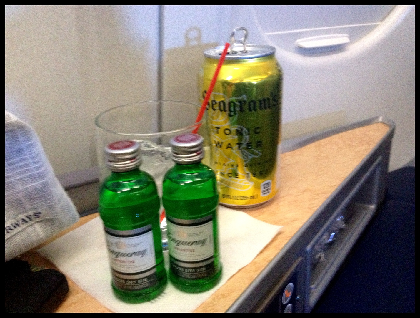 Ja ha, då får det bli en G&T ur en snygg flaska då? Nej du, är har designgänget tillsammans med inköp från Älmhult varit framme. ”Vi kör minibarflaskor”. Toppen! Men eftersom US Airways tanterna inte tänker på fylleriet, kommer det en dubbel direkt. Ok, man behövde inte fråga i alla fall.