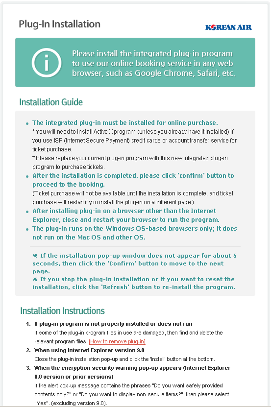 Mina erfarenheter av koreanska flygbolags hemsidor har inte varit speciellt upplyftande heller. Inte för att jag har råkat på några skumma plugins, men det brukar sluta med att man får gräva fram Internet Exploder, och till och med då funkar deras skräpsidor bara ibland.