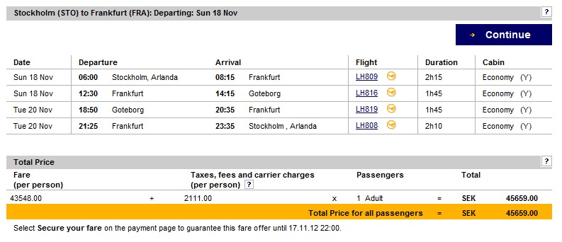 Malu skrev:Jag har en bokning med SAS till Göteborg på söndag och tänkte titta efter om det gick att göra en alternativ routing med LH via utlandet. Visst gick det. Vad tycker ni om priset?? Jag tror att jag står över erbjudandet. (Obs att det är Economy.)Visa bifogad bild 11034Klicka för att utvidga...
